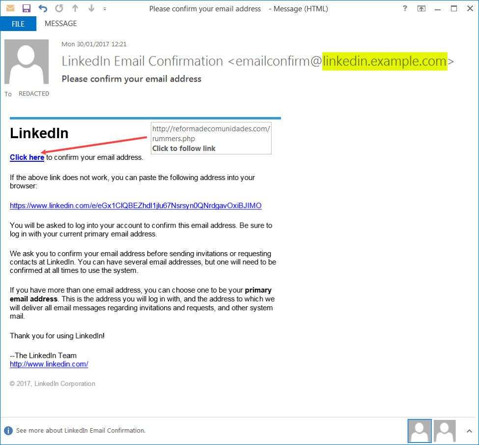 So here is an example of phishing email using sub domain to look like LinkedIn. As I mentioned above, right before the “.com” will be the domain and anything before that is considered sub domain( which can be anything). The Link pointed out in the picture shows that the link goes to another website. The actual link does not look anything like a linkedIn page as it show a different domain page as pointed out by the arrow.