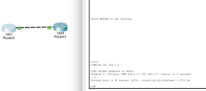 Step3– To assign IP I need to assign the IP to the port thats connecting the two devices together. In my case its interface g0/0(Gigabit port). I assigned the IP via “IP add” and give an private ip address along with a subnet. The “no shutdown” command changes the state of the interface from down to up. Now there will be connection as seen below, preform ping (IP Address) to confirm.